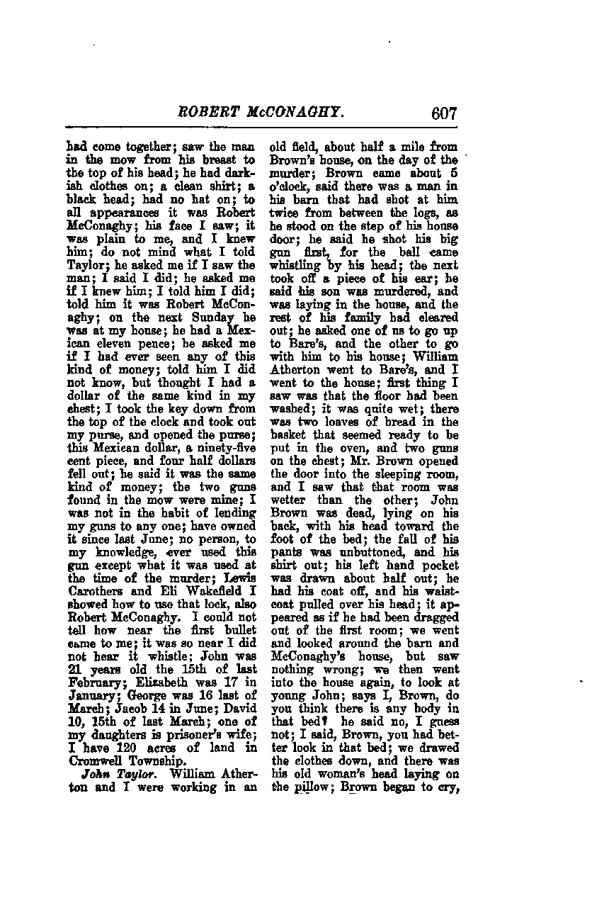 John Taylor, William Atherton, and I were working in an old field, about half a mile from Brown's house, on the day of the murder. Brown came about 5 o'clock and said there was a man in his barn who had shot at him twice from between the logs as he stood on the step of his house door. He said he shot his big gun first, for the ball came whistling by his head; the next took off a piece of his ear. He said his son was murdered and was lying in the house, and the rest of his family had cleared out. He asked one of us to go up to Bare’s, and the other to go with him to his house. William Atherton went to Bare’s, and I went to the house. The first thing I saw was that the floor had been washed; it was quite wet. There were two loaves of bread in the basket that seemed ready to be put in the oven, and two guns on the chest. Mr. Brown opened the door into the sleeping room, and I saw that that room was wetter than the other. John Brown was dead, lying on his back with his head toward the foot of the bed. The fall of his pants was unbuttoned, and his shirt was out. His left hand pocket was drawn about halfway out. He had his coat off, and his waistcoat was pulled over his head. It appeared as if he had been dragged out of the first room. We went and looked around the barn and McConaghy’s house but saw nothing wrong. We then went into the house again to look at young John. I said, "Brown, do you think there is anybody in that bed?" He said, "No, I guess not." I said, "Brown, you had better look in that bed." We drew the clothes down, and there was his old woman's head lying on the pillow. Brown began to cry.