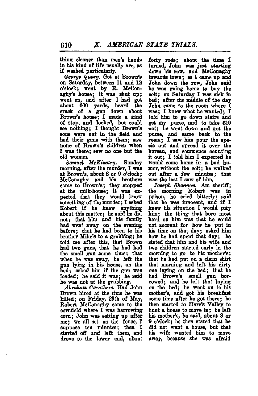 Abraham Carothers: I had John Brown hired at the time he was killed. On Friday, the 29th of May, Robert McConaghy came to the cornfield where I was harrowing corn. John was setting up after me, and we all sat on the fence for about ten minutes. Then I started off and left them, driving to the lower end, about forty rods away. About the time I turned, John was just starting down his row, and McConaghy was heading towards town. As I came up and John went down the row, John said he was going home to buy the colt. On Saturday, I was sick in bed. After the middle of the day, John came to the room where I was. I knew what he wanted; I told him to go downstairs and get my purse, and to take $10 out. He went down and got the purse, and came back to the room. I saw him pour the specie out and spread it over the bureau, and commence counting it out. I told him I expected he would come home in a bad humor, without the colt. He walked out after a few minutes; that was the last I saw of him.