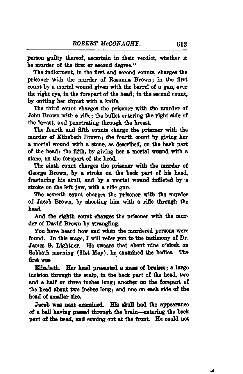 You have heard how and when the murdered persons were found. At this stage, I will refer you to the testimony of Dr. James G. Lightner. He swears that about nine o'clock on Sabbath morning (31st May), he examined the bodies. The first was Elizabeth. Her head presented a mass of bruises; a large incision through the scalp on the back part of the head, two and a half or three inches long; another on the forepart of the head about two inches long; and one on each side of the head of smaller size.