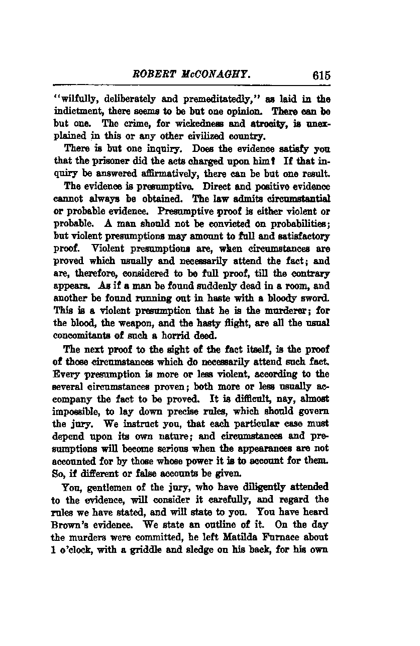 Gentlemen of the jury, you who have diligently attended to the evidence, will consider it carefully and adhere to the rules we have stated and will continue to state to you. You have heard Brown's testimony. We will outline it for you. On the day the murders were committed, he left Matilda Furnace around 1 o'clock, carrying a griddle and a sledge on his back, heading to his own home.