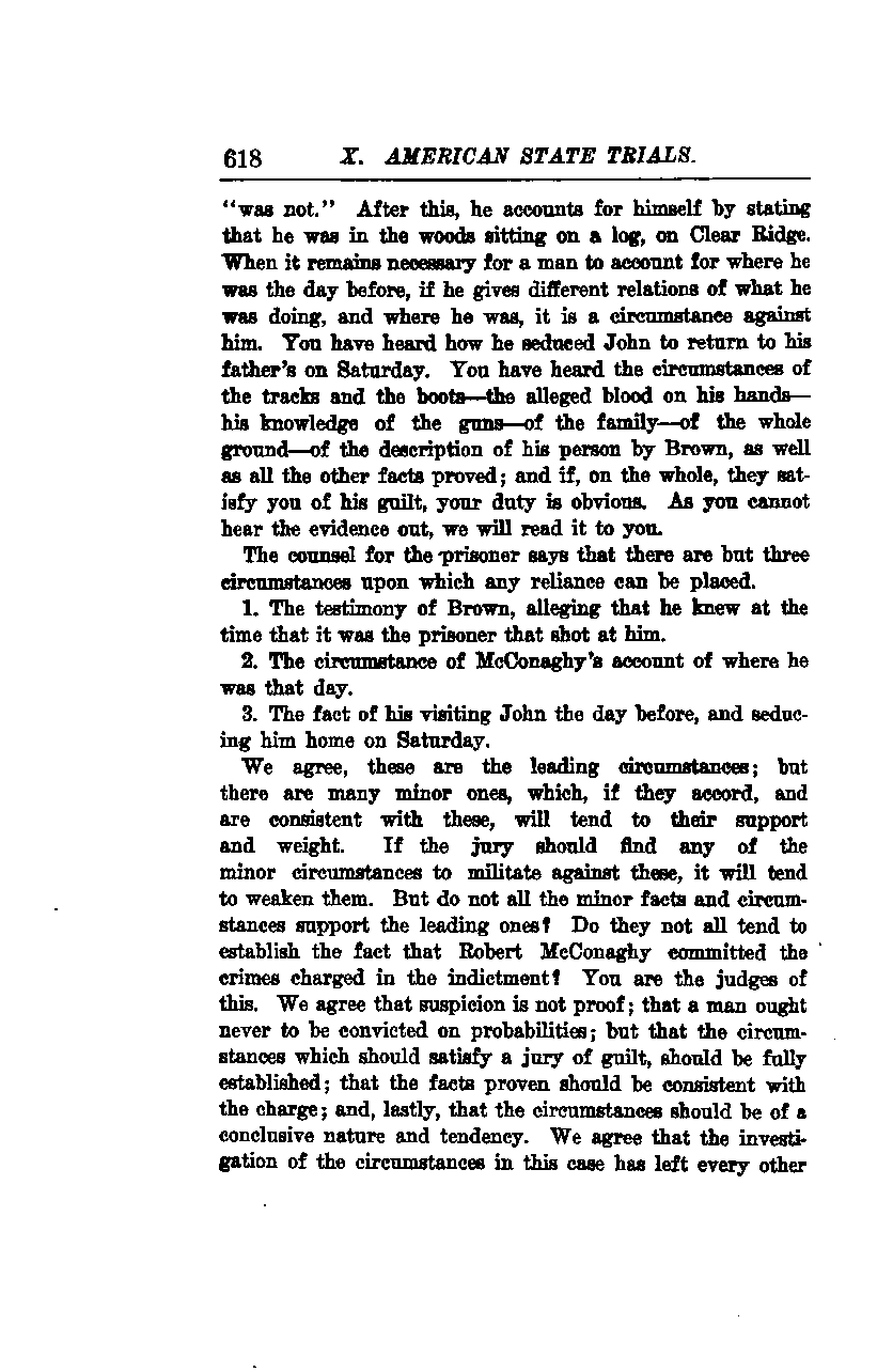 "It was not." After this, he accounts for himself by stating that he was in the woods sitting on a log, on Clear Ridge. When it remains necessary for a man to account for where he was the day before, if he gives different relations of what he was doing and where he was, it is a circumstance against him. You have heard how he seduced John to return to his father's on Saturday. You have heard the circumstances of the tracks and the boots—the alleged blood on his hands—his knowledge of the guns—of the family—of the whole ground—of the description of his person by Brown, as well as all the other facts proved; and if, on the whole, they satisfy you of his guilt, your duty is obvious. As you cannot hear the evidence out, we will read it to you.