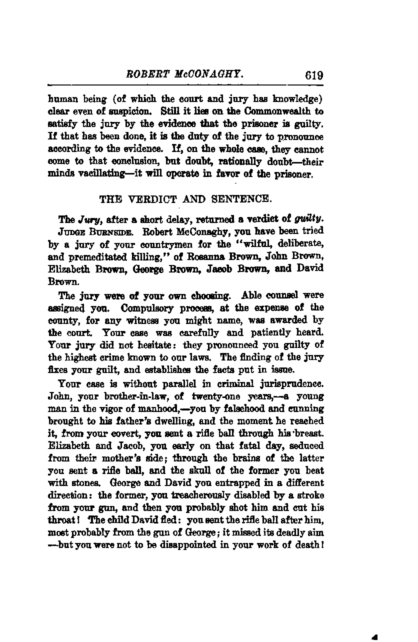 Judge Burnes: Robert McConaghy, you have been tried by a jury of your countrymen for the "wilful, deliberate, and premeditated killing" of Rosanna Brown, John Brown, Elizabeth Brown, George Brown, Jacob Brown, and David Brown.