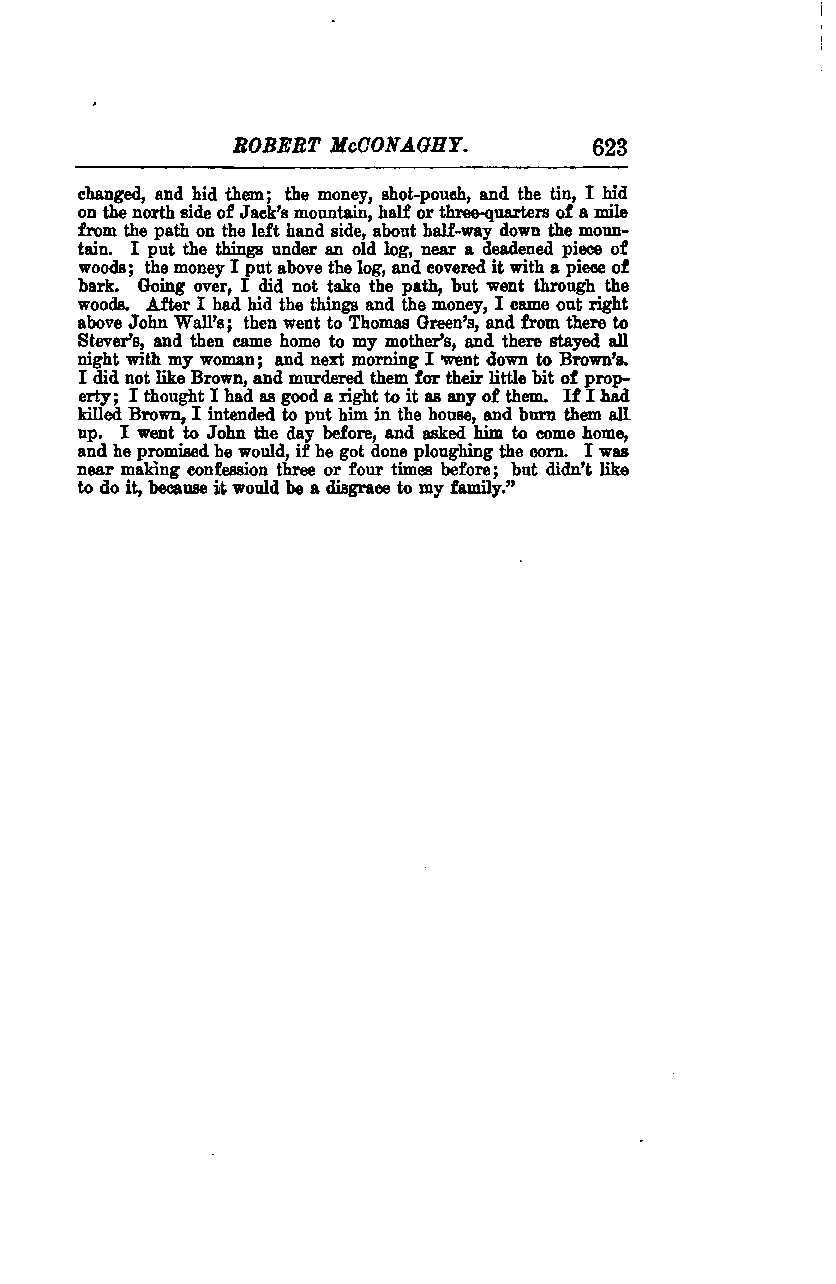 Going over, I did not take the path but went through the woods. After I had hidden the things and the money, I came out right above John Wall's; then went to Thomas Green's, and from there to Stever's, and then came home to my mother's, and there stayed all night with my woman; and next morning I went down to Brown's.