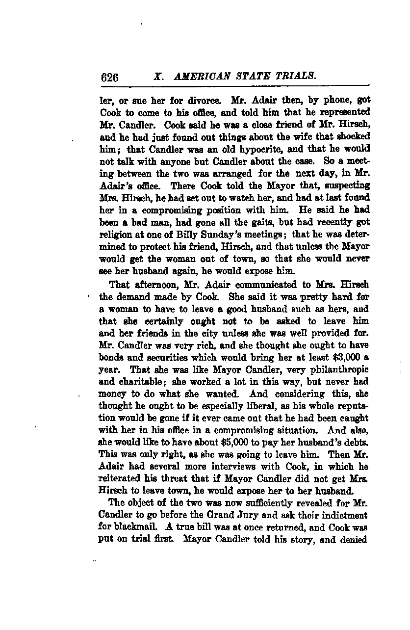 The intentions of Cook and Mrs. Hirsch were now clear enough for Mr. Candler to approach the Grand Jury and seek their indictment for blackmail. A true bill was immediately returned, and Cook was the first to be put on trial. Mayor Candler testified, denying the allegations against him.