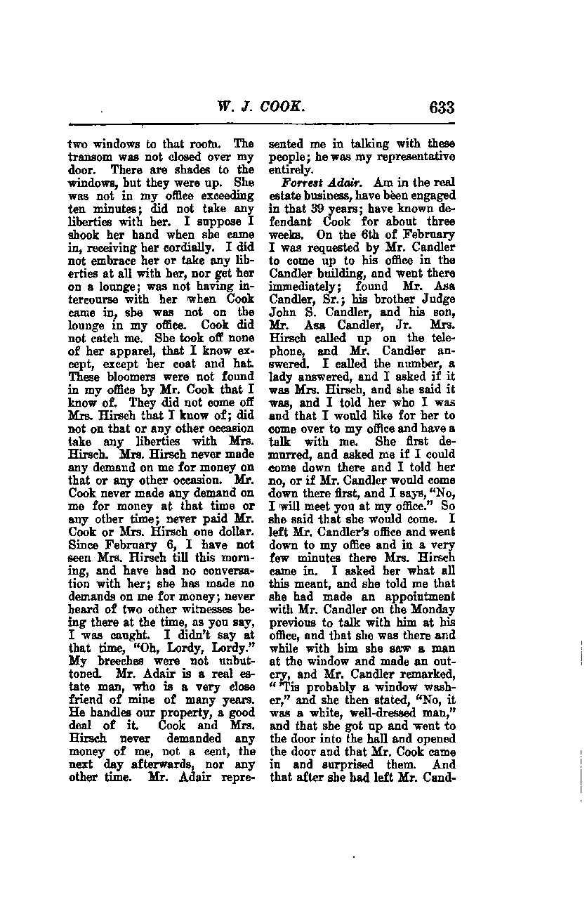 I am in the real estate business and have been engaged in it for 39 years; I have known defendant Cook for about three weeks. On the 6th of February, I was requested by Mr. Candler to come up to his office in the Candler building, and I went there immediately. I found Mr. Asa Candler, Sr.; his brother, Judge John S. Candler, and his son, Mr. Asa Candler, Jr. Mrs. Hirsch called up on the telephone, and Mr. Candler answered. I called the number, a lady answered, and I asked if it was Mrs. Hirsch, and she said it was. I told her who I was and that I would like for her to come over to my office and have a talk with me. She first demurred and asked me if I could come down there, and I told her no, or if Mr. Candler would come down there first, and I said, “No, I will meet you at my office.” So she said that she would come. I left Mr. Candler’s office and went down to my office, and in a very few minutes, Mrs. Hirsch came in. I asked her what all this meant, and she told me that she had made an appointment with Mr. Candler on the Monday previous to talk with him at his office, and that she was there and while with him, she saw a man at the window and made an outcry. Mr. Candler remarked, “It’s probably a window washer,” and she then stated, “No, it was a white, well-dressed man,” and that she got up and went to the door into the hall, opened the door, and Mr. Cook came in and surprised them. And that after she had left Mr. Candler...