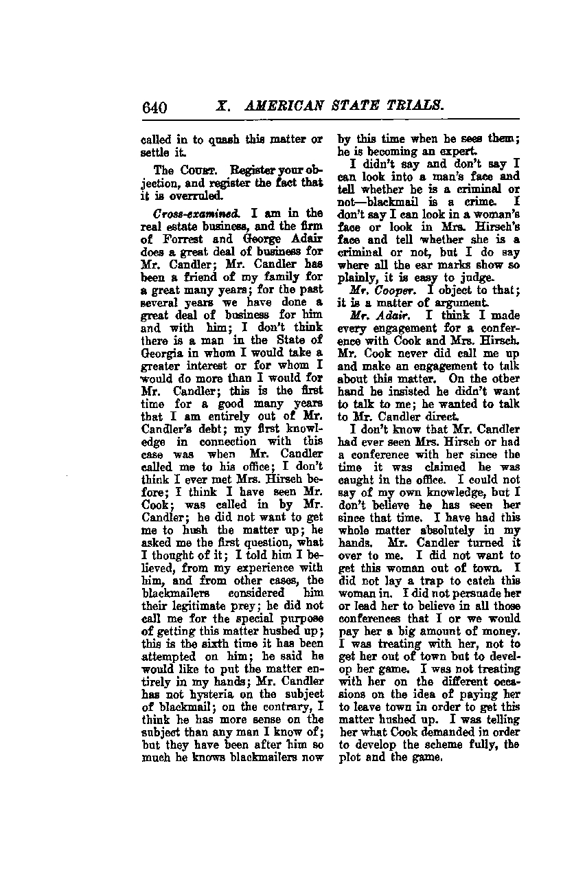 Cross-examined: I am in the real estate business, and the firm of Forrest and George Adair does a great deal of business for Mr. Candler. Mr. Candler has been a friend of my family for a great many years; for the past several years, we have done a great deal of business for him and with him. I don't think there is a man in the State of Georgia in whom I would take a greater interest or for whom I would do more than I would for Mr. Candler. This is the first time in many years that I am entirely out of Mr. Candler's debt. My first knowledge in connection with this case was when Mr. Candler called me to his office. I don't think I ever met Mrs. Hirsch before; I think I have seen Mr. Cook. I was called in by Mr. Candler; he did not want to get me to hush the matter up. He asked me the first question, what I thought of it. I told him I believed, from my experience with him and from other cases, that blackmailers considered him their legitimate prey. He did not call me for the special purpose of getting this matter hushed up; this is the sixth time it has been attempted on him. He said he would like to put the matter entirely in my hands. Mr. Candler has not hysteria on the subject of blackmail; on the contrary, I think he has more sense on the subject than any man I know of. But they have been after him so much that he knows blackmailers now by this time when he sees them; he is becoming an expert.