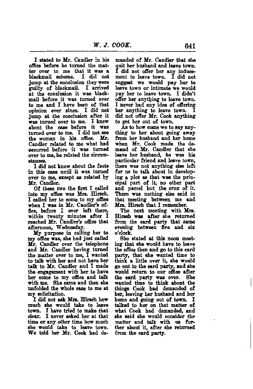 As to how we came to say anything to her about going away from her husband and her home, when Mr. Cook made the demand of Mr. Candler that she leave her husband, who was his particular friend, and leave town, there was not anything else left for us to talk about in developing a plot as that was the principal part of it, no other part and parcel but the crux of it. There was nothing else said in that meeting between me and Mrs. Hirsch that I remember.