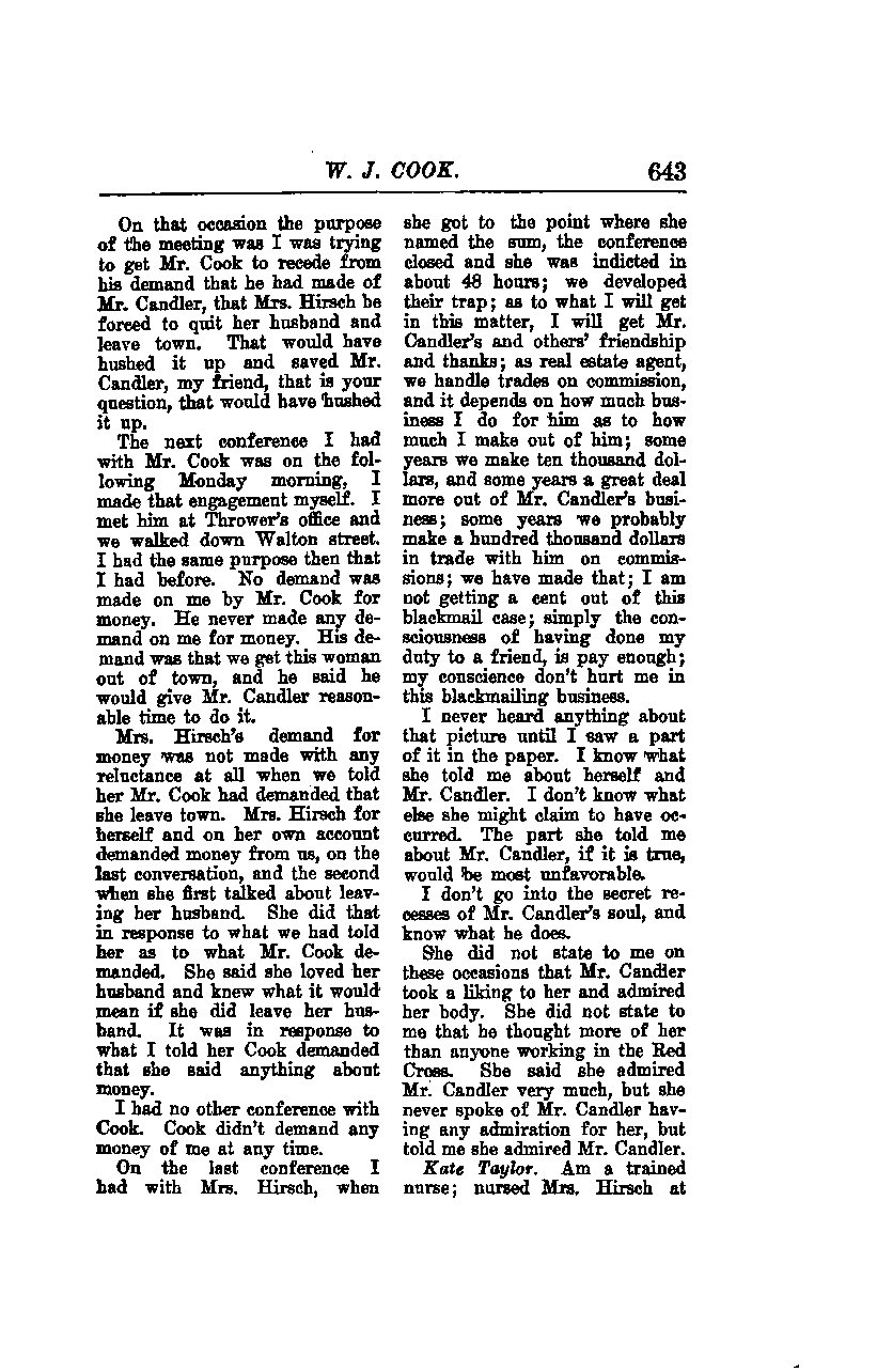 On the last conference I had with Mrs. Hirsch, when she got to the point where she named the sum, the conference closed, and she was indicted in about 48 hours. We developed their trap. As to what I will get in this matter, I will get Mr. Candler's and others' friendship and thanks. As a real estate agent, we handle trades on commission, and it depends on how much business I do for him as to how much I make out of him. Some years we make ten thousand dollars, and some years a great deal more out of Mr. Candler's business. Some years we probably make a hundred thousand dollars in trade with him on commissions. We have made that. I am not getting a cent out of this blackmail case; simply the consciousness of having done my duty to a friend is pay enough. My conscience doesn't hurt me in this blackmailing business.