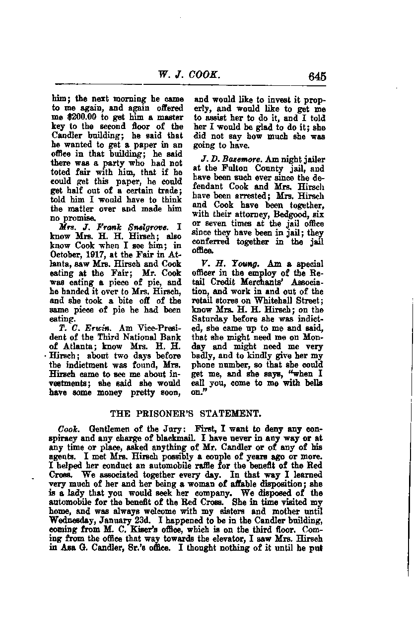 First, I want to deny any conspiracy and any charge of blackmail. I have never in any way or at any time or place asked anything of Mr. Candler or any of his agents. I met Mrs. Hirsch possibly a couple of years ago or more. I helped her conduct an automobile raffle for the benefit of the Red Cross. We associated together every day. In that way, I learned very much about her and her affable disposition; she is a lady whose company you would seek. We disposed of the automobile for the benefit of the Red Cross. She, in time, visited my home and was always welcome with my sisters and mother until Wednesday, January 23rd. I happened to be in the Candler building, coming from M. C. Kiser’s office, which is on the third floor. Coming from the office that way towards the elevator, I saw Mrs. Hirsch in Asa G. Candler, Sr.’s office. I thought nothing of it until he put...