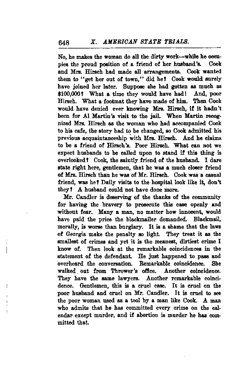 Mr. Candler is deserving of the thanks of the community for having the bravery to prosecute this case openly and without fear. Many a man, no matter how innocent, would have paid the price the blackmailer demanded. Blackmail, morally, is worse than burglary. It is a shame that the laws of Georgia make the penalty so light. They treat it as the smallest of crimes and yet it is the meanest, dirtiest crime I know of. Then look at the remarkable coincidences in the statement of the defendant. He just happened to pass and overheard the conversation. Remarkable coincidence. She walked out from Thrower's office. Another coincidence. They have the same lawyers. Another remarkable coincidence. Gentlemen, this is a cruel case. It is cruel on the poor husband and cruel on Mr. Candler. It is cruel to see the poor woman used as a tool by a man like Cook. A man who admits that he has committed every crime on the calendar except murder, and if abortion is murder, he has committed that.