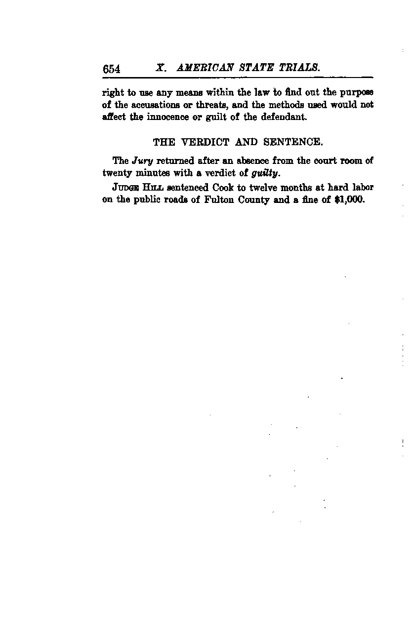 The jury returned after an absence of twenty minutes from the courtroom with a verdict of guilty. Judge Huw sentenced Cook to twelve months at hard labor on the public roads of Fulton County and a fine of $1,000.