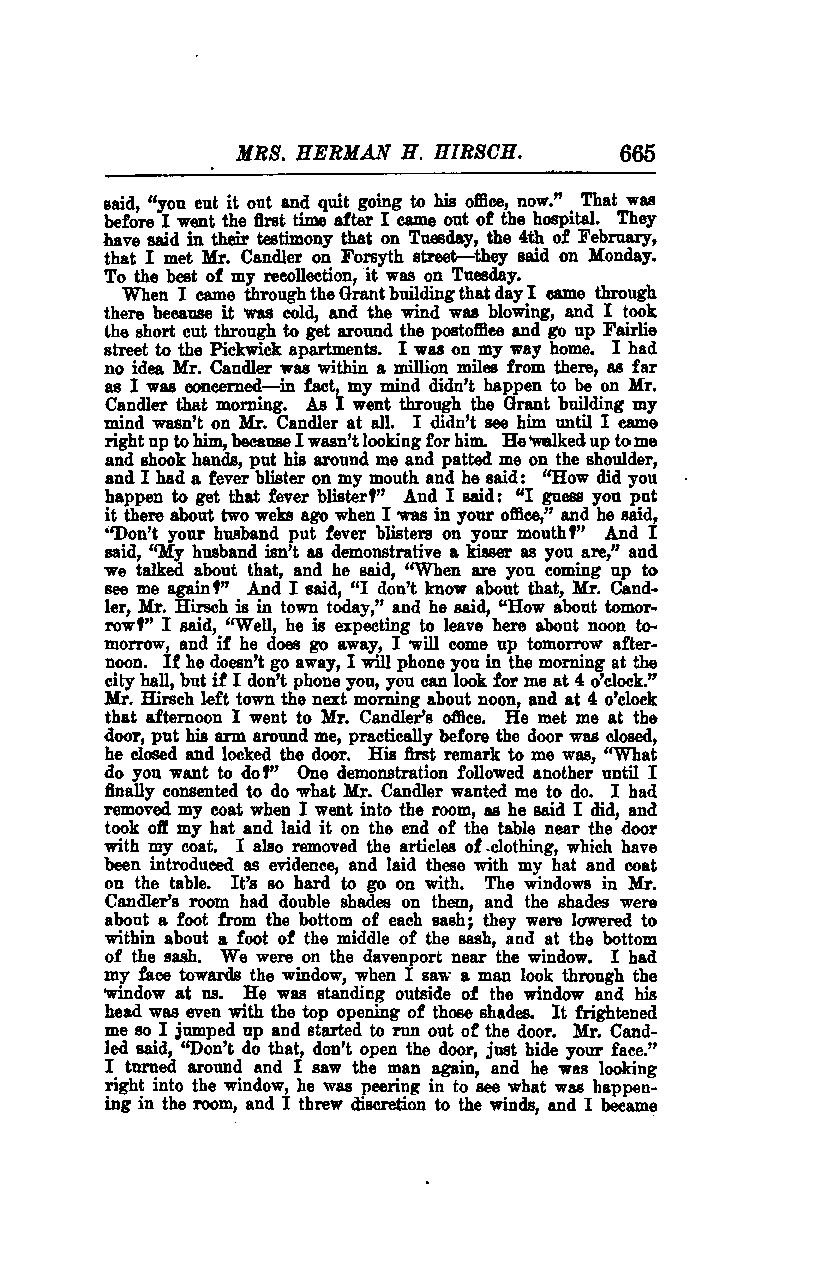 When I came through the Grant building that day, I came through there because it was cold, and the wind was blowing, and I took the shortcut through to get around the post office and go up Fairlie Street to the Pickwick apartments. I was on my way home. I had no idea Mr. Candler was within a million miles from there, as far as I was concerned—in fact, my mind didn’t happen to be on Mr. Candler that morning. As I went through the Grant building, my mind wasn’t on Mr. Candler at all. I didn’t see him until I came right up to him, because I wasn't looking for him. He walked up to me and shook hands, put his arm around me and patted me on the shoulder, and I had a fever blister on my mouth and he said, "How did you happen to get that fever blister?" And I said, "I guess you put it there about two weeks ago when I was in your office," and he said, "Doesn’t your husband put fever blisters on your mouth?" And I said, "My husband isn’t as demonstrative a kisser as you are," and we talked about that, and he said, "When are you coming up to see me again?" And I said, "I don’t know about that, Mr. Candler, Mr. Hirsch is in town today," and he said, "How about tomorrow?" I said, "Well, he is expecting to leave here about noon tomorrow, and if he does go away, I will come up tomorrow afternoon. If he doesn’t go away, I will phone you in the morning at the city hall, but if I don’t phone you, you can look for me at 4 o’clock." Mr. Hirsch left town the next morning about noon, and at 4 o'clock that afternoon I went to Mr. Candler’s office. He met me at the door, put his arm around me, practically before the door was closed, he closed and locked the door. His first remark to me was, "What do you want to do?" One demonstration followed another until I finally consented to do what Mr. Candler wanted me to do. I had removed my coat when I went into the room, as he said I did, and took off my hat and laid it on the end of the table near the door with my coat. I also removed the articles of clothing, which have been introduced as evidence, and laid these with my hat and coat on the table. It’s so hard to go on with.