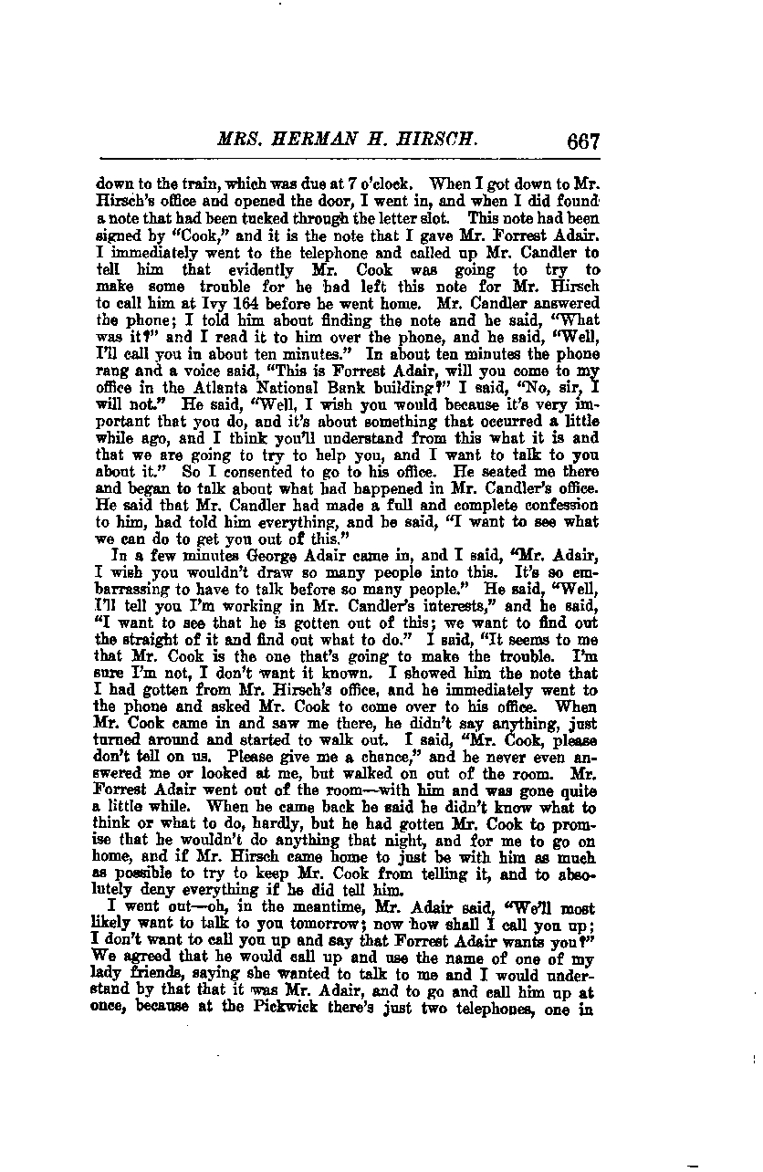 I went down to the train, which was due at 7 o'clock. When I arrived at Mr. Hirsch's office and opened the door, I found a note that had been tucked through the letter slot. The note was signed by "Cook," and it was the same note that I later gave to Mr. Forrest Adair. I immediately went to the telephone and called Mr. Candler to tell him that evidently Mr. Cook was going to try to cause some trouble, as he had left this note for Mr. Hirsch to call him at Ivy 164 before he went home. Mr. Candler answered the phone; I told him about finding the note, and he asked, "What was it?" I read it to him over the phone, and he said, "Well, I'll call you in about ten minutes." In about ten minutes, the phone rang, and a voice said, "This is Forrest Adair, will you come to my office in the Atlanta National Bank building?" I said, "No, sir, I will not." He said, "Well, I wish you would because it's very important that you do, and it's about something that occurred a little while ago, and I think you'll understand from this what it is and that we are going to try to help you, and I want to talk to you about it." So I consented to go to his office. He seated me there and began to talk about what had happened in Mr. Candler's office. He said that Mr. Candler had made a full and complete confession to him, had told him everything, and he said, "I want to see what we can do to get you out of this."