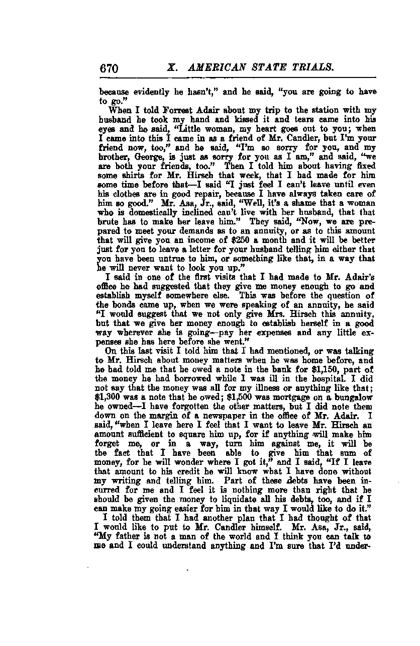 Then I told him about having fixed some shirts for Mr. Hirsch that week, shirts I had made for him some time before. I said, “I just feel I can't leave until even his clothes are in good repair because I have always taken care of him so well.” Mr. Asa, Jr., said, “Well, it’s a shame that a woman who is domestically inclined can’t live with her husband, that brute has to make her leave him.” They said, “Now, we are prepared to meet your demands as to an annuity or as to this amount that will give you an income of $250 a month. It will be better just for you to leave a letter for your husband telling him either that you have been untrue to him or something like that, in a way that he will never want to look you up.”