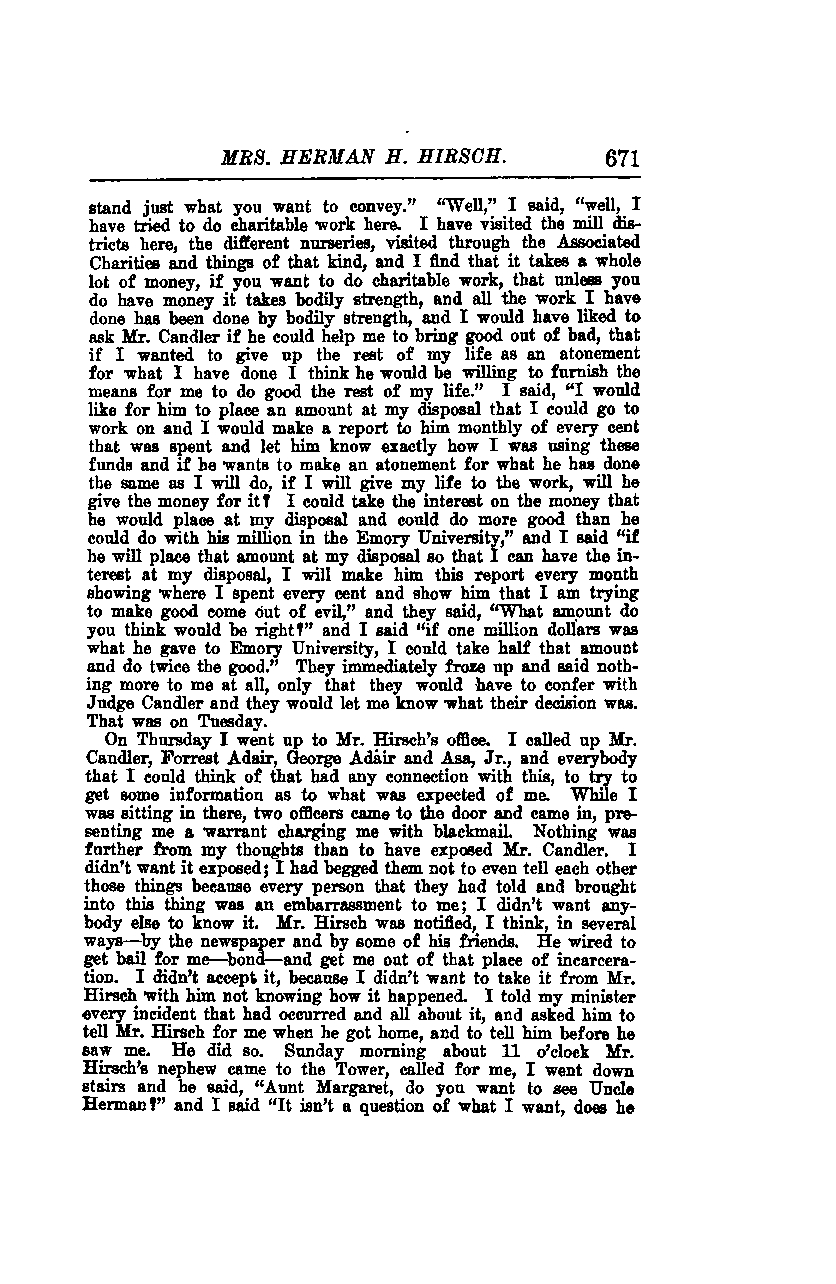 I tried to convey my intentions clearly. "Well," I said, "I have attempted to do charitable work here. I have visited the mill districts, the different nurseries, and worked through the Associated Charities. I have found that doing charitable work requires a lot of money. If you don't have money, it requires bodily strength. All the work I have done has been through bodily strength. I would have liked to ask Mr. Candler if he could help me bring good out of bad. If I wanted to dedicate the rest of my life as an atonement for what I have done, I think he would be willing to furnish the means for me to do good for the rest of my life."