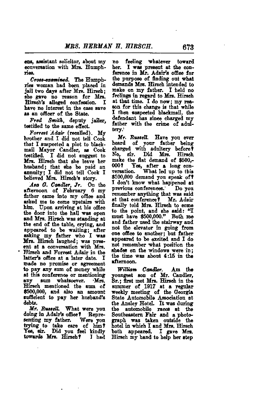 I am the youngest son of Mr. Candler. I first met Mrs. Hirsch in the summer of 1917 at a regular weekly meeting of the Georgia State Automobile Association at the Ansley Hotel. It was during the automobile races at the Southeastern Fair, and a photograph was taken outside the hotel in which both Mrs. Hirsch and I appeared. I gave Mrs. Hirsch my hand to help her step.