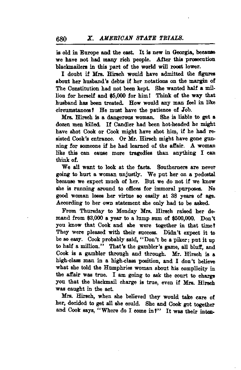 From Thursday to Monday, Mrs. Hirsch raised her demand from $3,000 a year to a lump sum of $500,000. Don’t you know that Cook and she were together in that time? They were pleased with their success. Didn’t expect it to be so easy. Cook probably said, "Don’t be a piker; put it up to half a million." That’s the gambler’s game, all bluff, and Cook is a gambler through and through. Mr. Hirsch is a high-class man in a high-class position, and I don’t believe what she told the Humphries woman about his complicity in the affair was true. I am going to ask the court to charge you that the blackmail charge is true, even if Mrs. Hirsch was caught in the act.