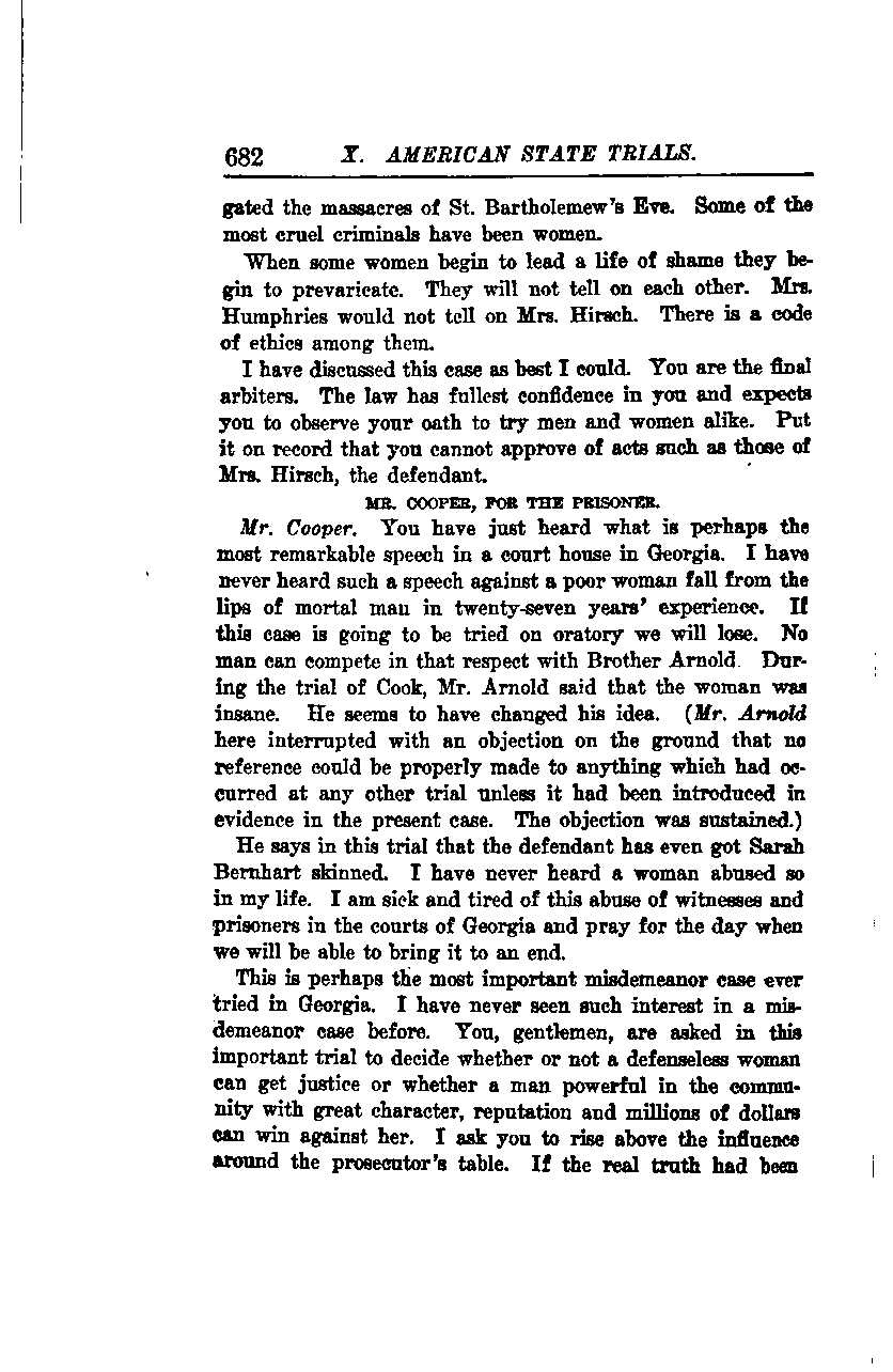 Mr. Cooper: You have just heard what is perhaps the most remarkable speech ever delivered in a courthouse in Georgia. In my twenty-seven years of experience, I have never heard such a speech against a poor woman fall from the lips of mortal man. If this case is going to be tried on oratory, we will lose. No man can compete in that respect with Brother Arnold. During the trial of Cook, Mr. Arnold said that the woman was insane. He seems to have changed his idea. (Mr. Arnold here interrupted with an objection on the ground that no reference could be properly made to anything which had occurred at any other trial unless it had been introduced in evidence in the present case. The objection was sustained.)