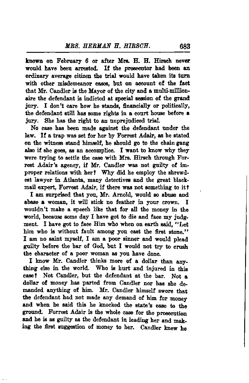 On February 6 or after, if the facts had been known, Mrs. H. H. Hirsch would never have been arrested. If the prosecutor had been an ordinary average citizen, the trial would have proceeded like any other misdemeanor case. However, due to the fact that Mr. Candler is the Mayor of the city and a multi-millionaire, the defendant was indicted at a special session of the grand jury. Regardless of his financial or political standing, the defendant still has rights in a courthouse before a jury. She has the right to an unprejudiced trial.