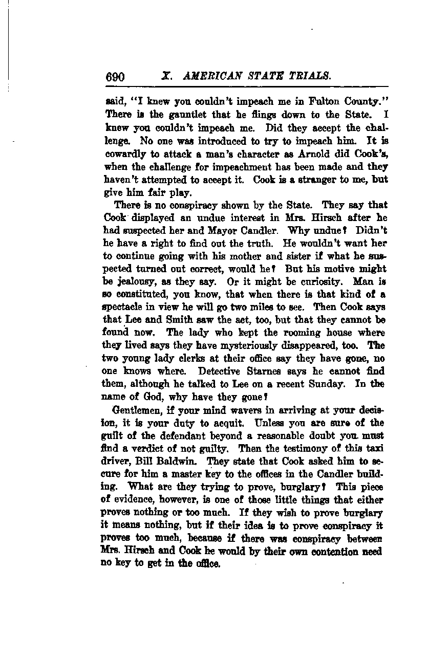 Gentlemen, if your mind wavers in arriving at your decision, it is your duty to acquit. Unless you are sure of the guilt of the defendant beyond a reasonable doubt, you must find a verdict of not guilty. Then there is the testimony of this taxi driver, Bill Baldwin. They state that Cook asked him to secure for him a master key to the offices in the Candler building. What are they trying to prove, burglary? This piece of evidence, however, is one of those little things that either proves nothing or too much. If they wish to prove burglary, it means nothing, but if their idea is to prove conspiracy, it proves too much. Because if there was a conspiracy between Mrs. Hirsch and Cook, he would, by their own contention, need no key to get into the office.