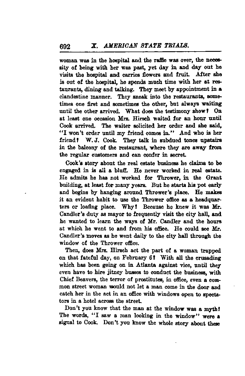 Then, does Mrs. Hirsch act the part of a woman trapped on that fateful day, February 6? With all the crusading against vice going on in Atlanta, to the point where they even had to hire jitney buses to conduct the business, and with Chief Beavers, the terror of prostitutes, in office, even a common street woman would not let a man come in the door and catch her in the act in an office with windows open to spectators in a hotel across the street.