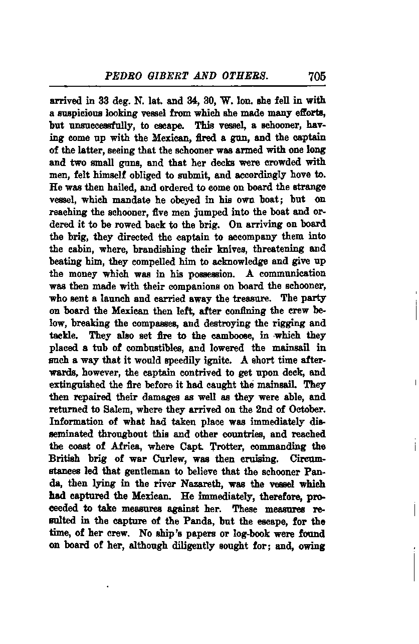 News of the incident quickly spread across various countries, reaching as far as the coast of Africa. There, Captain Trotter, commanding the British brig of war Curlew, was cruising. Circumstances led him to suspect that the schooner Panda, then anchored in the river Nazareth, was the vessel responsible for capturing the Mexican. Captain Trotter promptly took action against the Panda, resulting in its capture. However, the crew managed to escape temporarily. Despite thorough searches, no ship's papers or logbook were found on board the Panda.