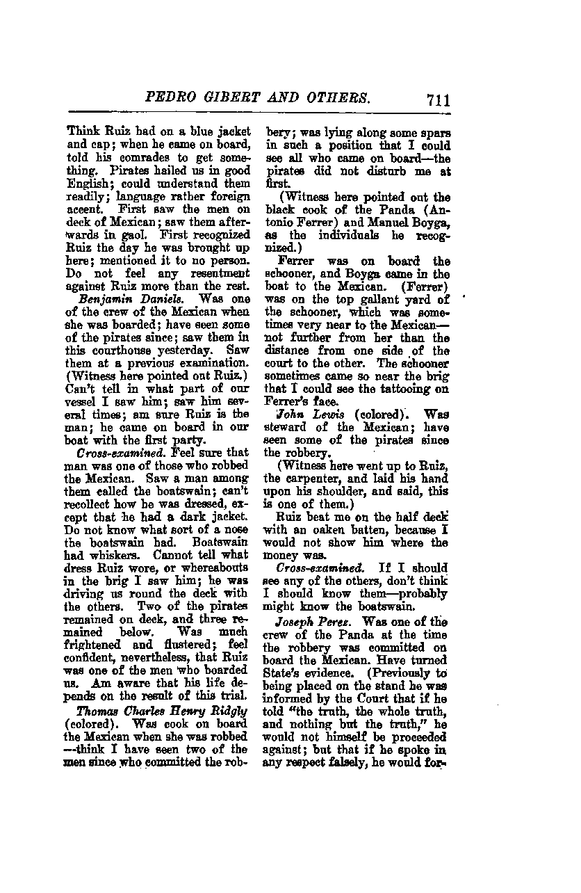 John Lewis (colored) testified, "I was the steward of the Mexican and have seen some of the pirates since the robbery." (The witness here went up to Ruiz, the carpenter, laid his hand upon his shoulder, and said, "This is one of them.") "Ruiz beat me on the half deck with an oaken batten because I would not show him where the money was."