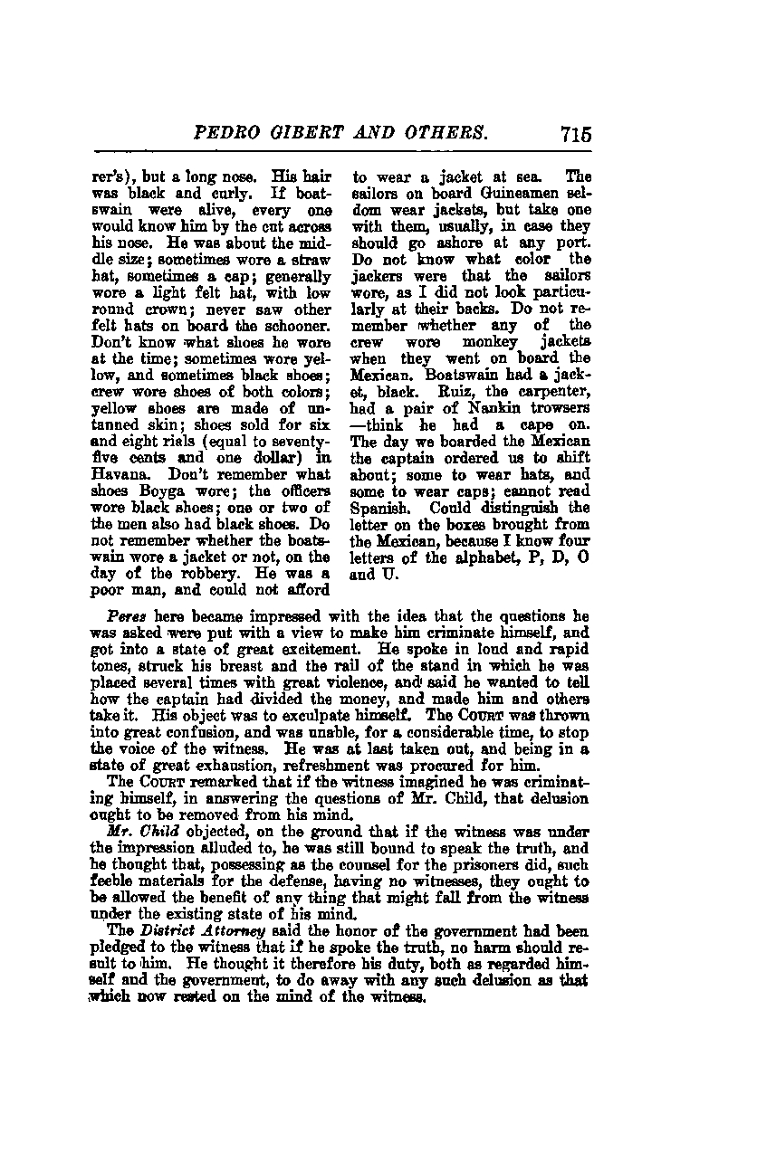 The boatswain had a distinctive appearance with a long nose and black, curly hair. If he were alive, everyone would recognize him by the scar across his nose. He was of medium height and sometimes wore a straw hat, sometimes a cap, but generally a light felt hat with a low round crown. I never saw other felt hats on board the schooner. I don't recall what shoes he wore at the time; sometimes he wore yellow shoes, sometimes black. The crew wore shoes of both colors. Yellow shoes were made of untanned skin and sold for six and eight riels (equivalent to seventy-five cents and one dollar) in Havana. I don't remember what shoes Boyga wore; the officers wore black shoes, and one or two of the men also had black shoes. I do not remember whether the boatswain wore a jacket on the day of the robbery. He was a poor man and could not afford to wear a jacket at sea. Sailors on board Guineamen seldom wear jackets but usually take one with them in case they should go ashore at any port. I do not know what color the jackets were that the sailors wore, as I did not look particularly at their backs. I do not remember whether any of the crew wore monkey jackets when they went on board the Mexican. The boatswain had a black jacket. Ruiz, the carpenter, had a pair of Nankin trousers—I think he had a cape on. The day we boarded the Mexican, the captain ordered us to shift about; some to wear hats and some to wear caps. I cannot read Spanish but could distinguish the letters on the boxes brought from the Mexican because I know four letters of the alphabet: P, D, O, and U.