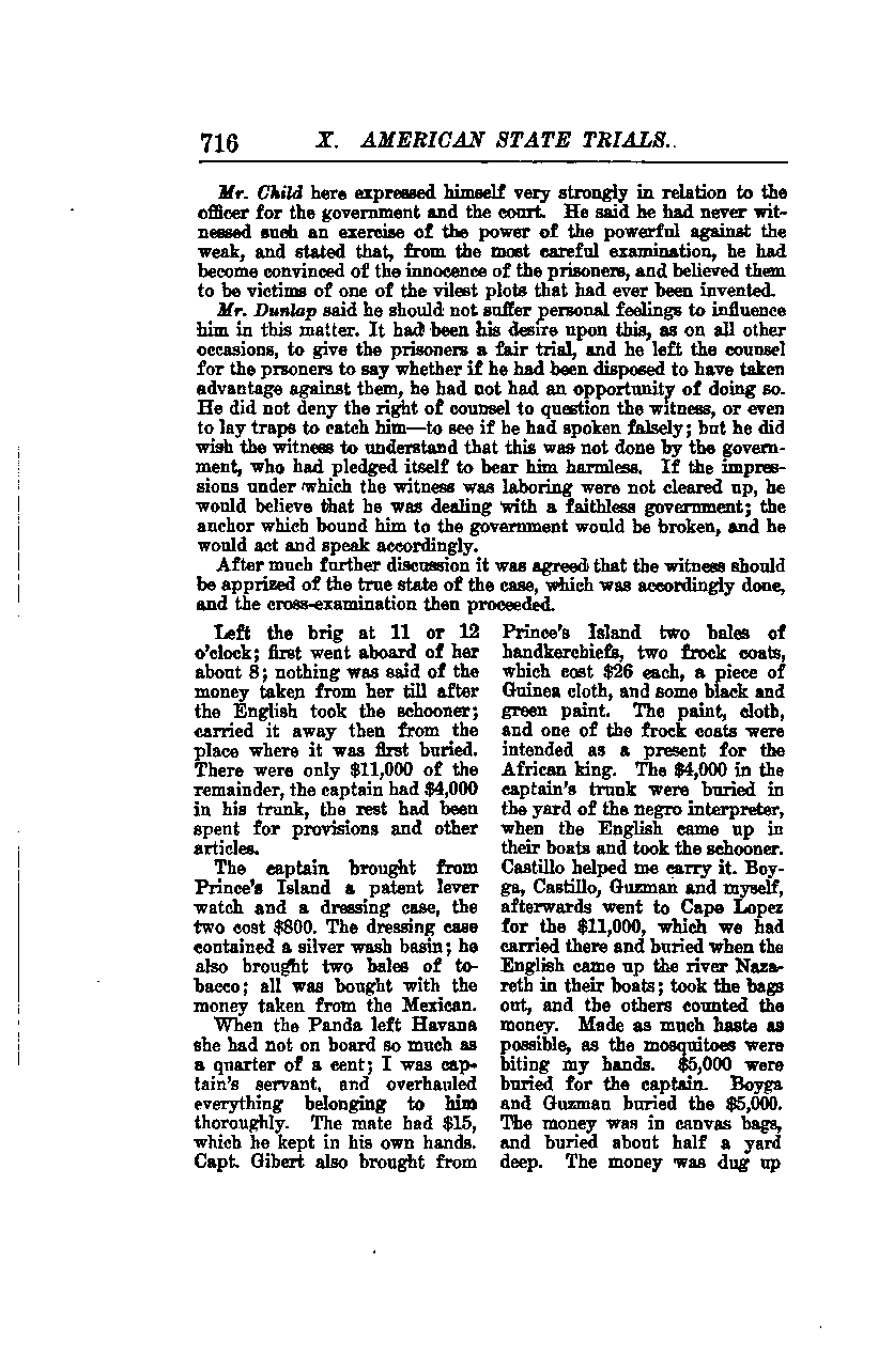 When the Panda left Havana, she did not have on board so much as a quarter of a cent. I was the captain’s servant and thoroughly overhauled everything belonging to him. The mate had $15, which he kept in his own hands. Capt. Gibert also brought from Prince's Island two bales of handkerchiefs, two frock coats, which cost $26 each, a piece of Guinea cloth, and some blue and green paint. The paint, cloth, and one of the frock coats were intended as a present for the African king. The $4,000 in the captain’s trunk were buried in the yard of the negro interpreter when the English came up in their boats and took the schooner. Castillo helped me carry it. Boyga, Castillo, Guzman, and I later went to Cape Lopez for the $11,000, which we had carried there and buried when the English came up the river Nazareth in their boats. We took the bags out, and the others counted the money. We made as much haste as possible, as the mosquitoes were biting my hands. $5,000 were buried for the captain. Boyga and Guzman buried the $5,000. The money was in canvas bags and buried about half a yard deep. The money was dug up.