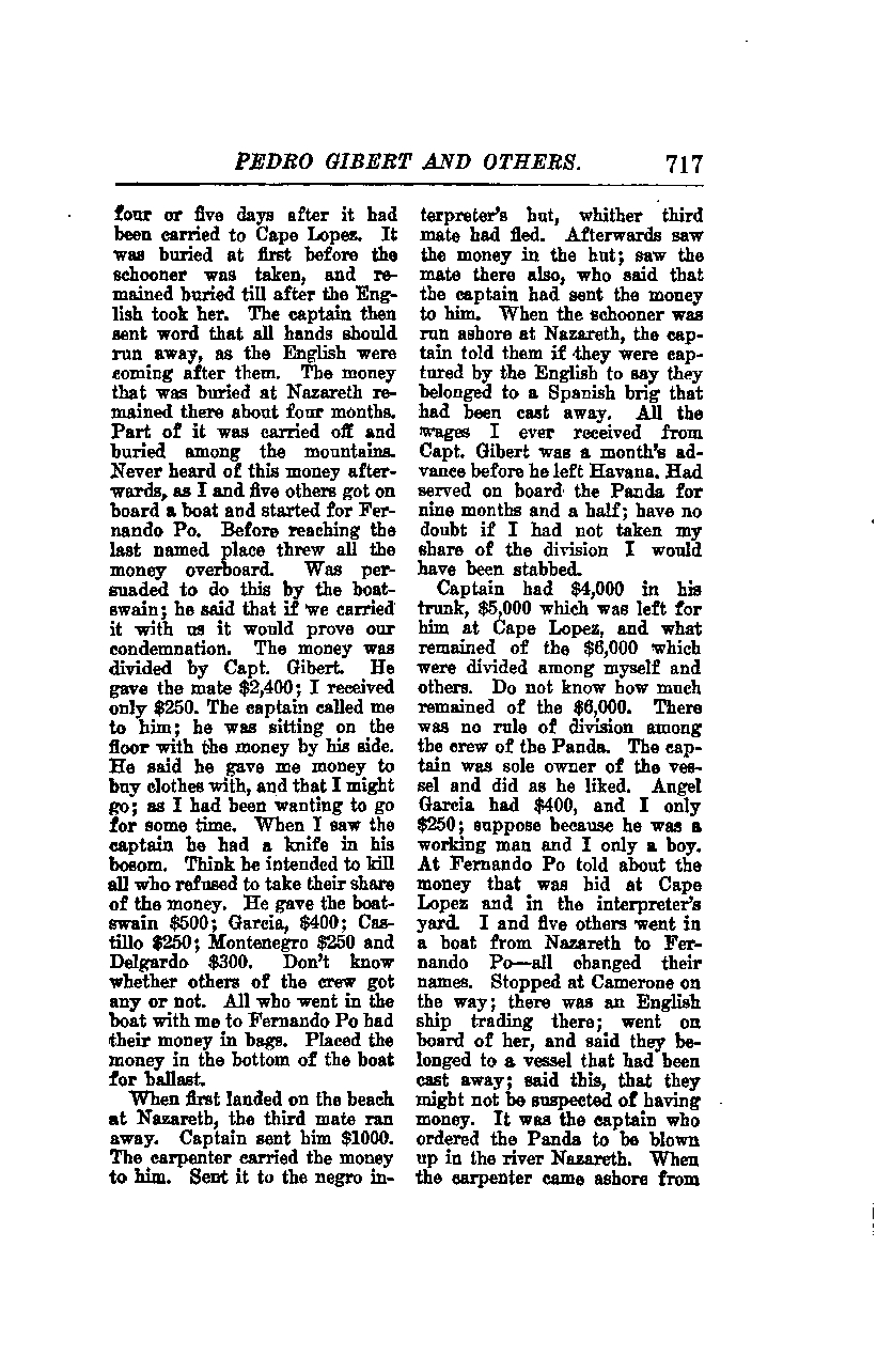 The captain had $4,000 in his trunk, $5,000 which was left for him at Cape Lopez, and what remained of the $8,000 which were divided among myself and others. I do not know how much remained of the $6,000. There was no rule of division among the crew of the Panda. The captain was the sole owner of the vessel and did as he liked. Angel Garcia had $400, and I only $250, I suppose because he was a working man and I was only a boy. At Fernando Po, I told about the money that was hidden at Cape Lopez and in the interpreter’s yard. I and five others went in a boat from Nazareth to Fernando Po—all changed their names. We stopped at Camerone on the way; there was an English ship trading there. We went on board her and said we belonged to a vessel that had been cast away, saying this so that we might not be suspected of having money. It was the captain who ordered the Panda to be blown up in the river Nazareth. When the carpenter came ashore from the Panda, he...