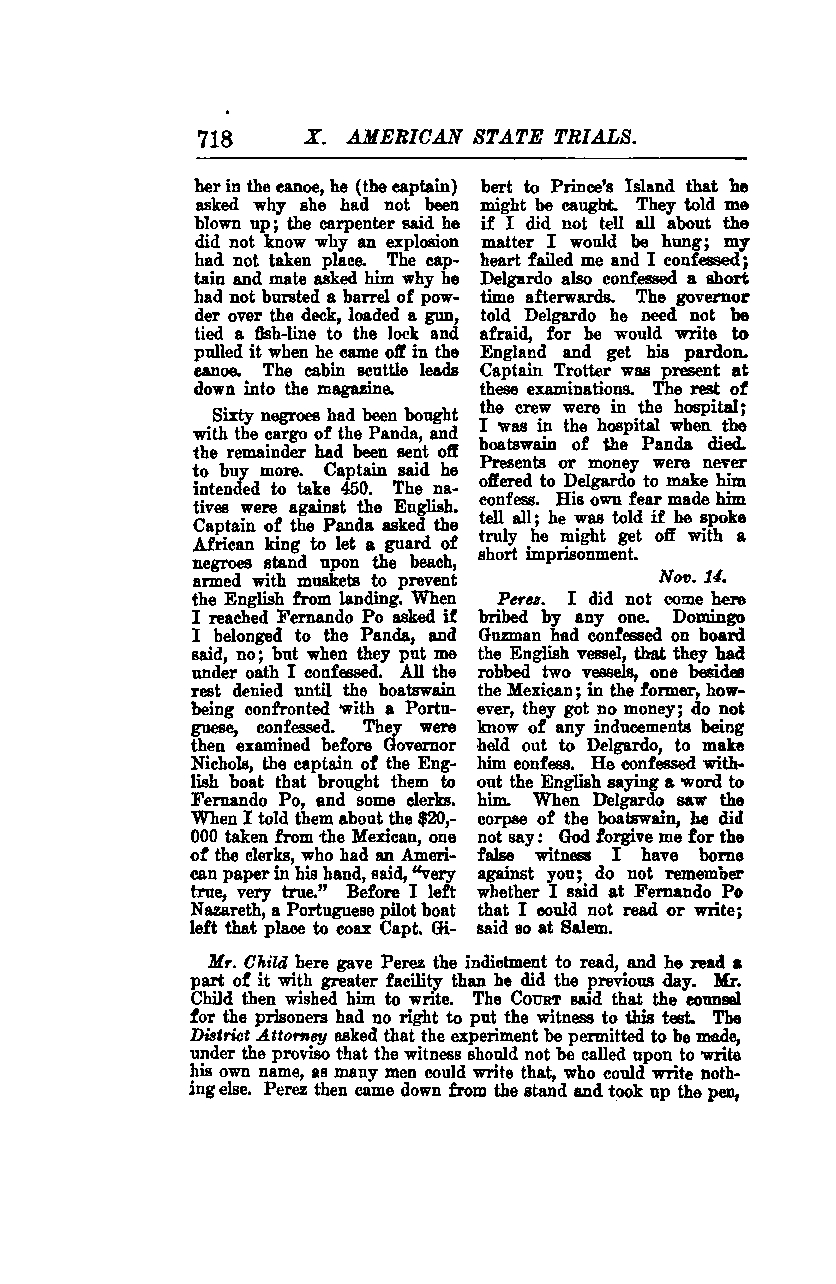Perez: I did not come here bribed by anyone. Domingo Guzman had confessed on board the English vessel that they had robbed two vessels, one besides the Mexican; in the former, however, they got no money. I do not know of any inducements being held out to Delgardo to make him confess. He confessed without the English saying a word to him. When Delgardo saw the corpse of the boatswain, he did not say: "God forgive me for the false witness I have borne against you." I do not remember whether I said at Fernando Po that I could not read or write; I said so at Salem.