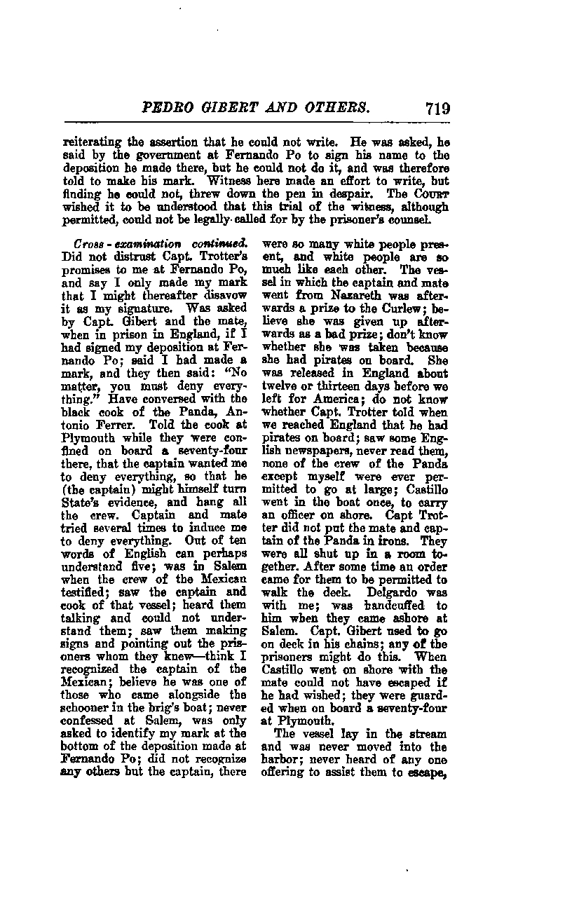 He had conversed with the black cook of the Panda, Antonio Ferrer. He told the cook at Plymouth, while they were confined on board a seventy-four there, that the captain wanted him to deny everything so that the captain might himself turn State’s evidence and hang all the crew. The captain and mate tried several times to induce him to deny everything.