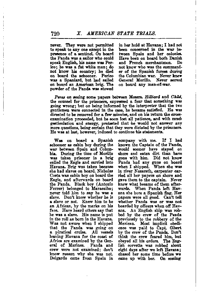 They were never permitted to speak to anyone except in the presence of a sentinel. On board the Panda was a sailor who could speak English; his name was Perico. He was a fat white man, but I do not know his country. He died on board the schooner. Perico was a Spaniard but had sailed on board an American brig. The powder of the Panda was stowed in her hold at Havana. I had not been concerned in the war between Spain and her colonies. I have been on board both Danish and French merchantmen. I do not know who was the commander of the Spanish forces during the Colombian war. I never knew General Morillo and never served on board any man-of-war.
