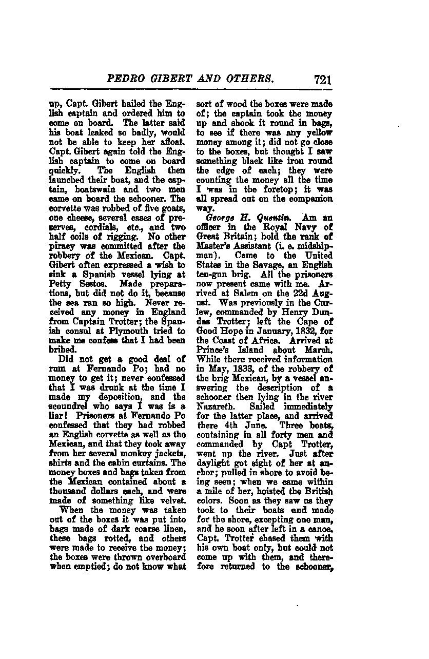 George H. Quentin, an officer in the Royal Navy of Great Britain, holds the rank of Master's Assistant (i.e., midshipman). I came to the United States in the Savage, an English ten-gun brig. All the prisoners now present came with me. We arrived at Salem on the 22nd of August. I was previously in the Curlew, commanded by Henry Dundas Trotter. We left the Cape of Good Hope in January 1832 for the Coast of Africa. We arrived at Prince's Island around March. While there, we received information in May 1833 of the robbery of the brig Mexican by a vessel matching the description of a schooner then lying in the river Nazareth. We sailed immediately for the latter place and arrived there on the 4th of June.