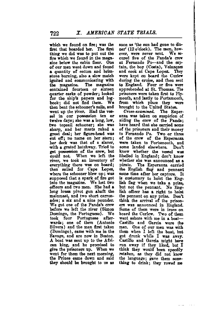 During cross-examination, it was revealed that the Esperanza was taken on suspicion of aiding the crew of the Panda. I have heard that she carried some of the prisoners and their money to Fernando Po. Two or three of the crew of the Esperanza were taken to Portsmouth, and some landed elsewhere. I don't know whether the vessel was libeled in England or whether she was announced as a pirate. The Esperanza carried the English flag and pennant for some time after her capture. It is customary to hoist the English flag when we take a prize, but not the pennant. No English officer has the right to hoist the pennant on any prize. I don’t think the arrival of the prisoners was announced in England. Some of them were in irons on board the Curlew. Two of them went ashore with me in a boat—Castillo and Garcia were the men. One of our men was with them when I left the boat, but he got drunk while I was away. Castillo and Garcia might have run away if they liked, but I think they would have been speedily retaken, as they did not know the language. I gave them something to drink, and they rowed me back.