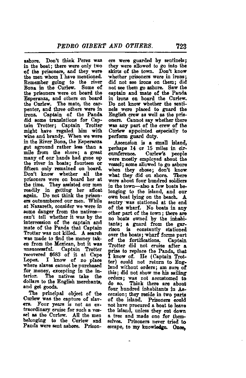 The principal objective of the Curlew was the capture of slavers. Four years is not an extraordinary cruise for such a vessel as the Curlew. All the men belonging to the Curlew and Panda were sent ashore. Prisoners were guarded by sentinels; they were allowed to go into the outskirts of the town. I don't know whether prisoners were in irons; I did not see irons on them; I did not see them go ashore. I saw the captain and mate of the Panda in irons on board the Curlew. I do not know whether the sentinels were placed to guard the English crew as well as the prisoners. I cannot say whether any part of the crew of the Curlew was appointed especially to perform guard duty.