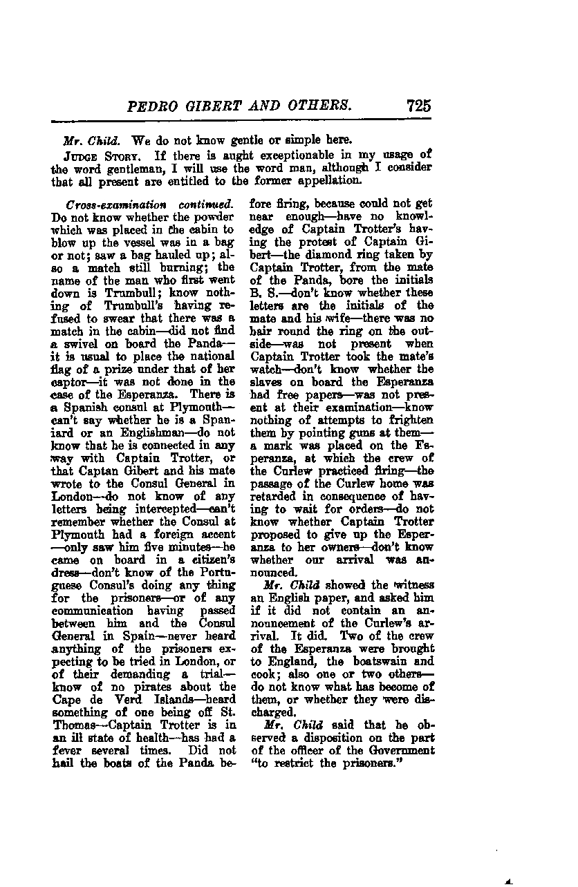 I do not know whether the powder placed in the cabin to blow up the vessel was in a bag or not. I saw a bag hauled up and also a match still burning. The name of the man who first went down is Trumbull. I know nothing of Trumbull having refused to swear that there was a match in the cabin. We did not find a swivel on board the Panda. It is usual to place the national flag of a prize under that of her captor, but it was not done in the case of the Esperanza.