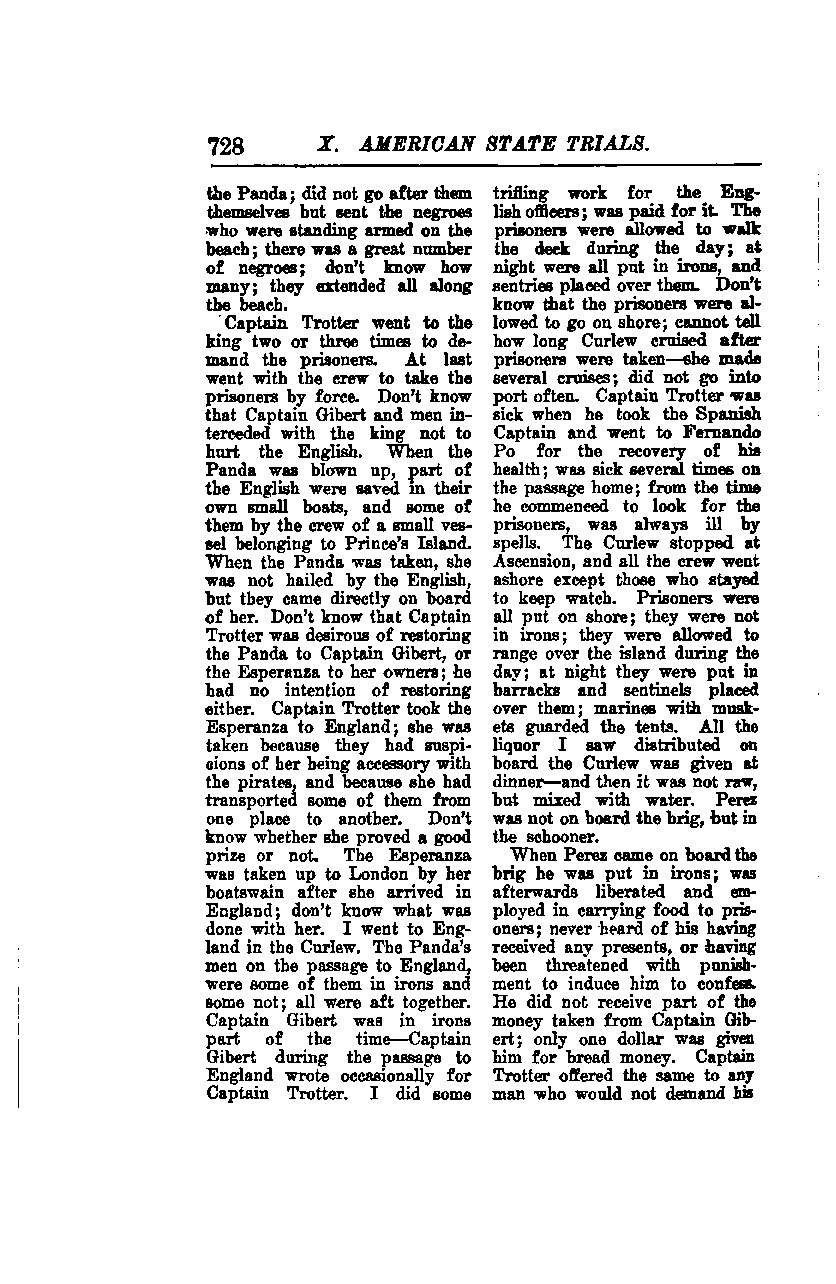 When Perez came on board the brig, he was put in irons; he was later liberated and employed in carrying food to prisoners. I never heard of him receiving any presents or being threatened with punishment to induce him to confess. He did not receive part of the money taken from Captain Gibert; only one dollar was given to him for bread money. Captain Trotter offered the same to any man who would not demand his share.