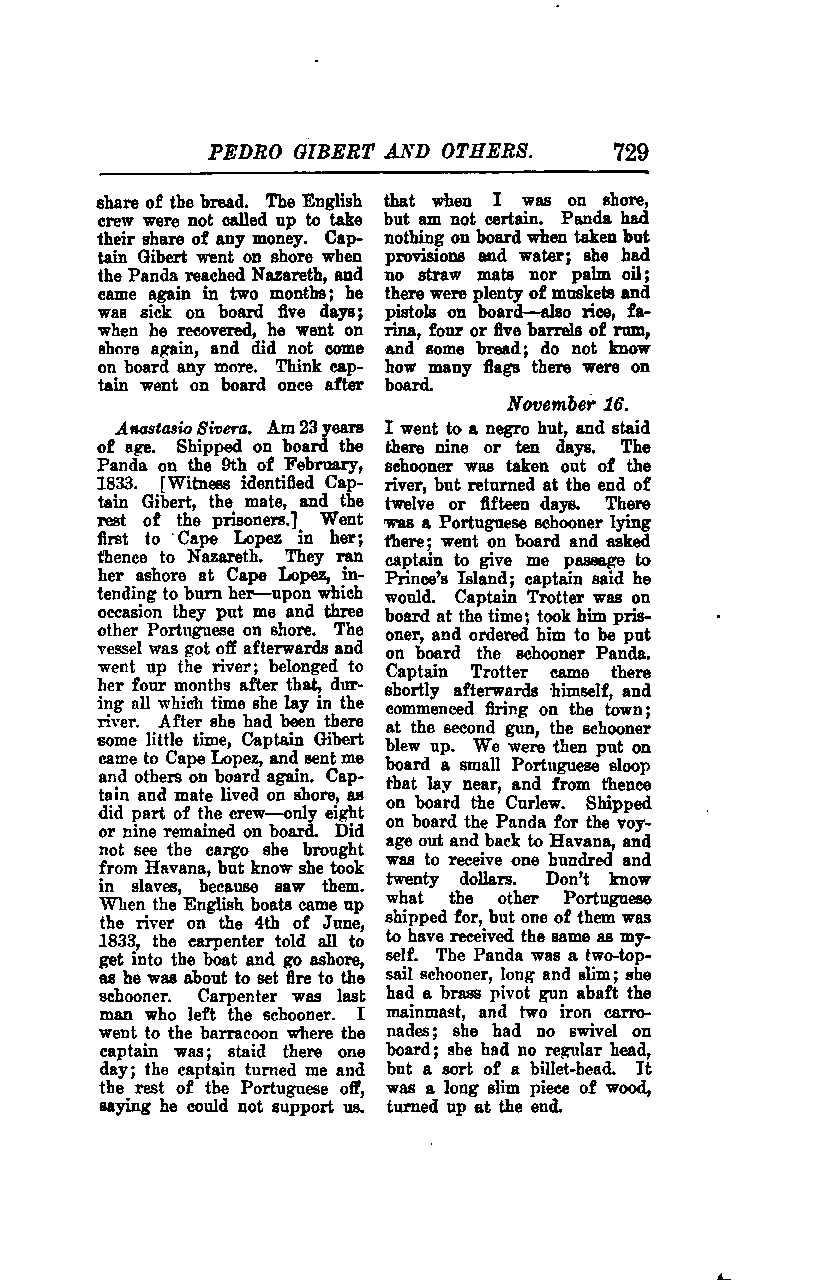 Anastasio Sivera, 23 years of age, shipped on board the Panda on the 8th of February, 1833. [The witness identified Captain Gibert, the mate, and the rest of the prisoners.] We first went to Cape Lopez and then to Nazareth. They ran her ashore at Cape Lopez, intending to burn her—on which occasion they put me and three other Portuguese on shore. The vessel was later refloated and went up the river. I belonged to her for four months after that, during which time she lay in the river. After she had been there for some time, Captain Gibert came to Cape Lopez and sent me and others on board again. The captain and mate lived on shore, as did part of the crew—only eight or nine remained on board. I did not see the cargo she brought from Havana, but I know she took in slaves because I saw them.