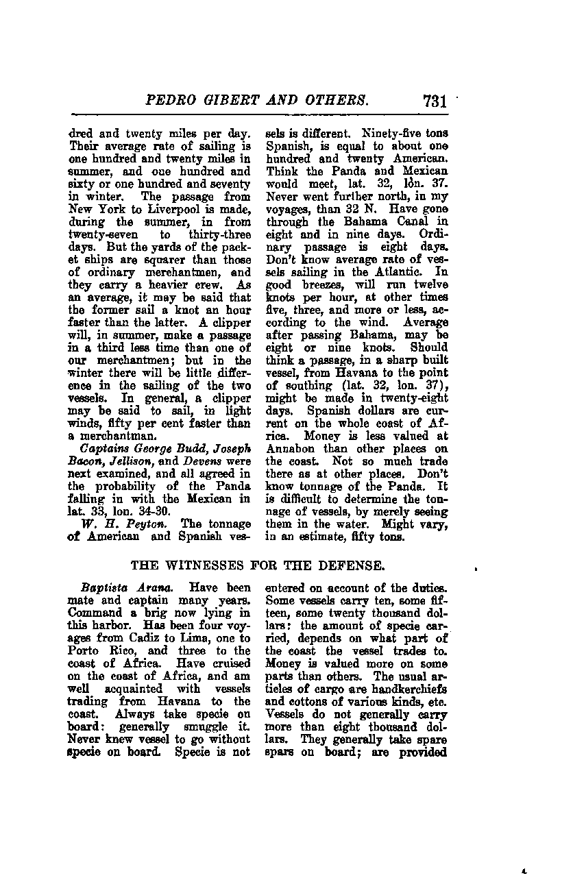 W. H. Peyton stated that the tonnage of American and Spanish vessels is different. Ninety-five tons Spanish is approximately equal to one hundred and twenty American tons. He believed the Panda and Mexican would meet at latitude 32, longitude 37. He never went further north in his voyages than 32° N. He has traversed the Bahama Canal in eight and nine days, with the ordinary passage being eight days. He was unsure of the average rate of vessels sailing in the Atlantic. In good breezes, vessels can run twelve knots per hour, while at other times, they may run five, three, or more or less, depending on the wind. After passing the Bahamas, the average speed may be eight or nine knots. He estimated that a passage in a sharp-built vessel from Havana to the point of southing (latitude 32, longitude 37) might be made in twenty-eight days. Spanish dollars are current along the entire coast of Africa. Money is less valued at Annabon than at other places on the coast. There is not as much trade there as in other locations. He did not know the tonnage of the Panda, as it is difficult to determine the tonnage of vessels by merely seeing them in the water. Estimates might vary by fifty tons.