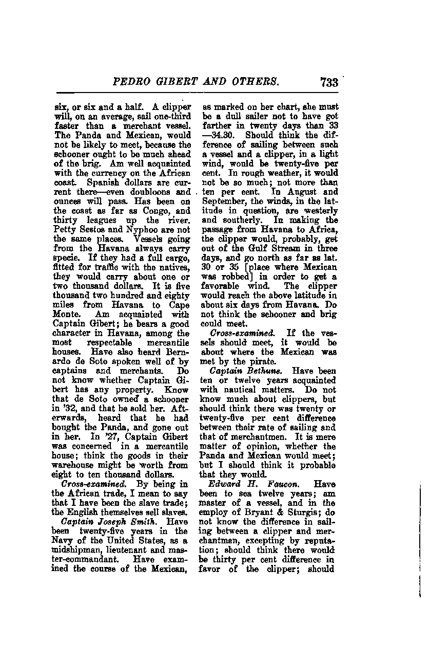 Captain Joseph Smith: I have been twenty-five years in the Navy of the United States, as a midshipman, lieutenant, and master-commandant. I have examined the course of the Mexican, as marked on her chart. She must be a dull sailor not to have gotten farther in twenty days than 33—34.20. I should think the difference in sailing between such a vessel and a clipper, in a light wind, would be twenty-five percent. In rough weather, it would not be so much; not more than ten percent. In August and September, the winds, in the latitude in question, are westerly and southerly. In making the passage from Havana to Africa, the clipper would probably get out of the Gulf Stream in three days and go north as far as lat. 30 or 35 [place where Mexican was robbed] in order to get a favorable wind. The clipper would reach the above latitude in about six days from Havana. I do not think the schooner and brig could meet.