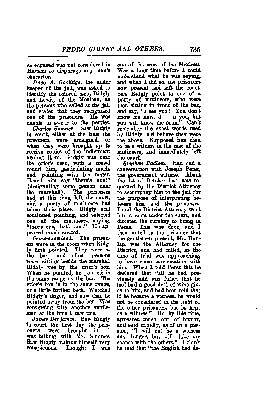 Charles Sumner saw Ridgly in court, either at the time the prisoners were arraigned or when they were brought up to receive copies of the indictment against them. Ridgly was near the crier's desk, surrounded by a crowd, gesticulating much and pointing with his finger. He heard him say, "There's one!" (designating some person near the marshal). The prisoners had, at this time, left the court, and a party of mutineers had taken their place. Ridgly continued pointing and selected one of the mutineers, saying, "That's one, that's one." He appeared much excited.