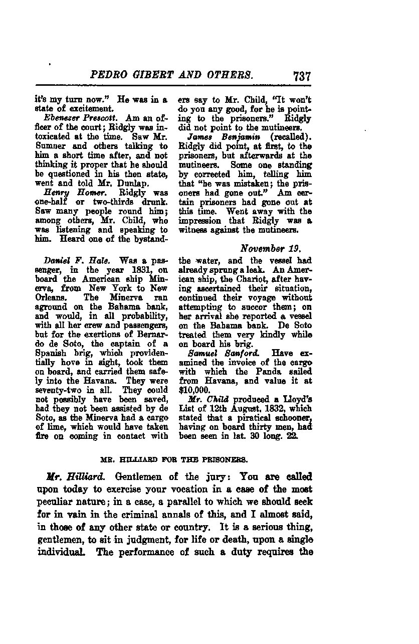 Mr. Hilliard: Gentlemen of the jury, you are called upon today to exercise your vocation in a case of the most peculiar nature; a case, a parallel to which we should seek for in vain in the criminal annals of this, and I almost said, in those of any other state or country. It is a serious thing, gentlemen, to sit in judgment, for life or death, upon a single individual. The performance of such a duty requires the utmost care and consideration.