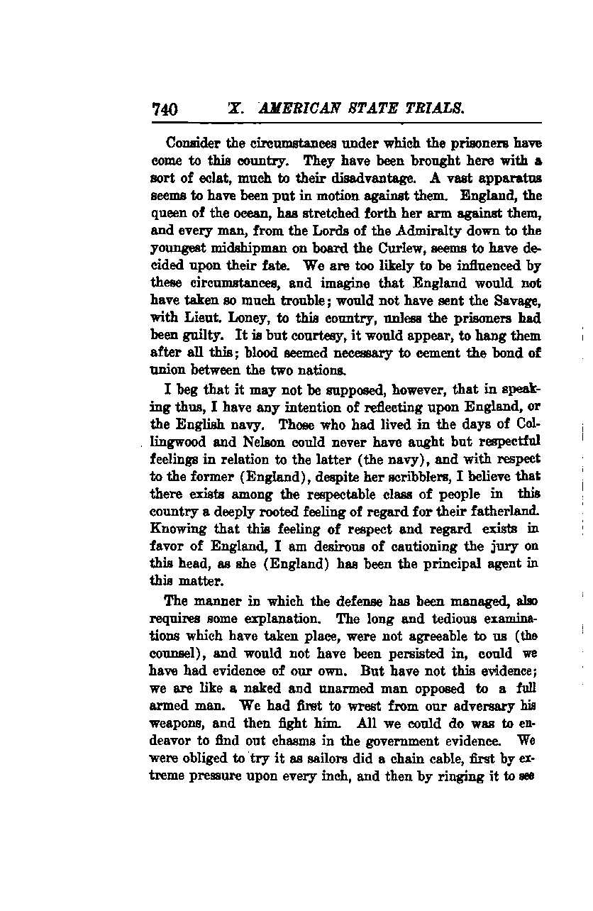 I beg that it may not be supposed, however, that in speaking thus, I have any intention of reflecting upon England or the English navy. Those who had lived in the days of Collingwood and Nelson could never have aught but respectful feelings in relation to the latter (the navy), and with respect to the former (England), despite her scribblers, I believe that there exists among the respectable class of people in this country a deeply rooted feeling of regard for their fatherland. Knowing that this feeling of respect and regard exists in favor of England, I am desirous of cautioning the jury on this head, as she (England) has been the principal agent in this matter.