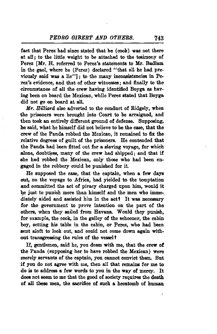 "If, gentlemen," he said, "you agree with me that the crew of the Panda (assuming she robbed the Mexican) were merely servants of the captain, you cannot convict them. But if you do not agree with me, then all that remains for me to do is to address a few words to you in the way of mercy. It does not seem to me that the good of society requires the death of all these men, the sacrifice of such a hecatomb of human lives."