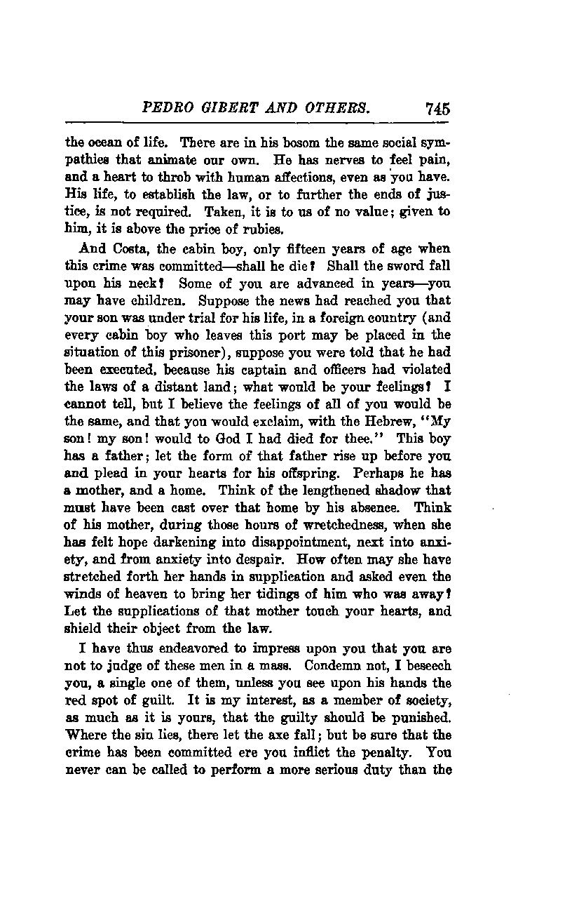 And Costa, the cabin boy, only fifteen years of age when this crime was committed—shall he die? Shall the sword fall upon his neck? Some of you are advanced in years—you may have children. Suppose the news reached you that your son was on trial for his life in a foreign country (and every cabin boy who leaves this port may find himself in the situation of this prisoner). Suppose you were told that he had been executed because his captain and officers violated the laws of a distant land; what would be your feelings? I cannot tell, but I believe the feelings of all of you would be the same, and that you would exclaim, with the Hebrew, “My son! My son! Would to God I had died for thee.”