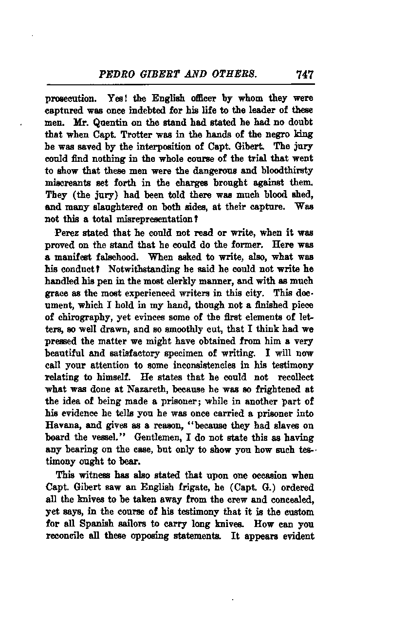 Now, I will draw your attention to some inconsistencies in his testimony regarding himself. He stated that he could not recall what happened at Nazareth because he was so frightened at the prospect of being made a prisoner. Yet, in another part of his evidence, he recounts being taken as a prisoner to Havana, explaining it was "because they had slaves on board the vessel." Gentlemen, I do not present this as having any direct bearing on the case, but to illustrate how such testimony should be weighed.