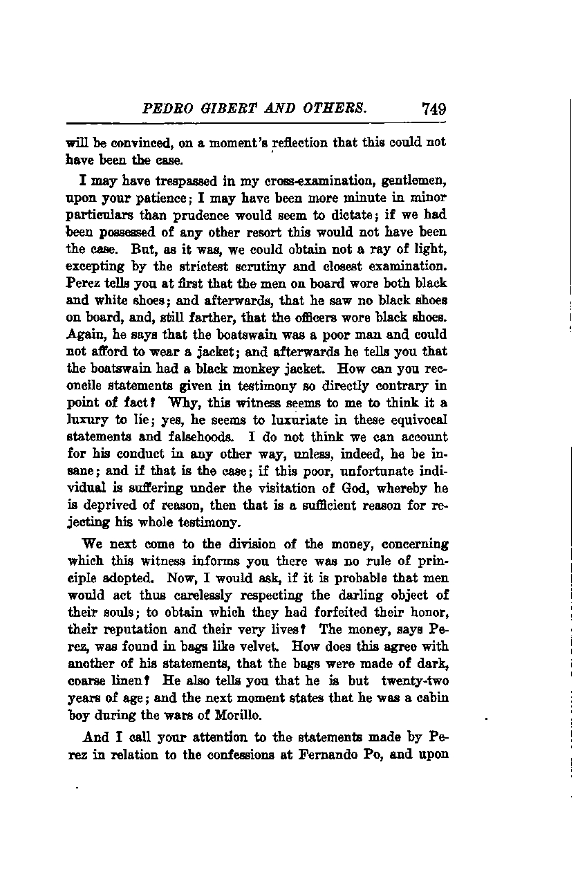 We next come to the division of the money, concerning which this witness informs you there was no rule or principle adopted. Now, I would ask if it is probable that men would act so carelessly regarding the darling object of their souls, to obtain which they had forfeited their honor, their reputation, and their very lives. The money, says Perez, was found in bags like velvet. How does this agree with another of his statements that the bags were made of dark, coarse linen? He also tells you that he is but twenty-two years of age, and the next moment states that he was a cabin boy during the wars of Morillo.