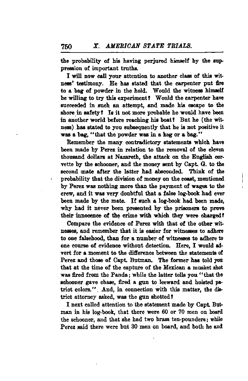 Compare the evidence of Perez with that of the other witnesses, and remember that it is easier for a single witness to adhere to one falsehood than for a number of witnesses to maintain a consistent course of evidence without detection. Here, I would like to draw your attention to the difference between the statements of Perez and those of Capt. Butman. Perez has told you that at the time of the capture of the Mexican, a musket shot was fired from the Panda, while Capt. Butman tells you, "the schooner gave chase, fired a gun to leeward, and hoisted patriot colors." In connection with this matter, the district attorney asked, was the gun loaded with shot?