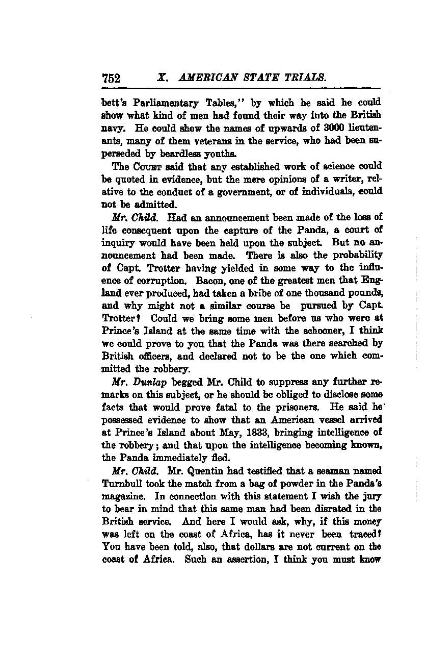 Mr. Dunlap urged Mr. Child to refrain from further remarks on this subject, warning that he would be compelled to disclose facts that could prove detrimental to the prisoners. He claimed to possess evidence showing that an American vessel arrived at Prince's Island around May 1833, bringing news of the robbery, and that upon learning of this intelligence, the Panda immediately fled.